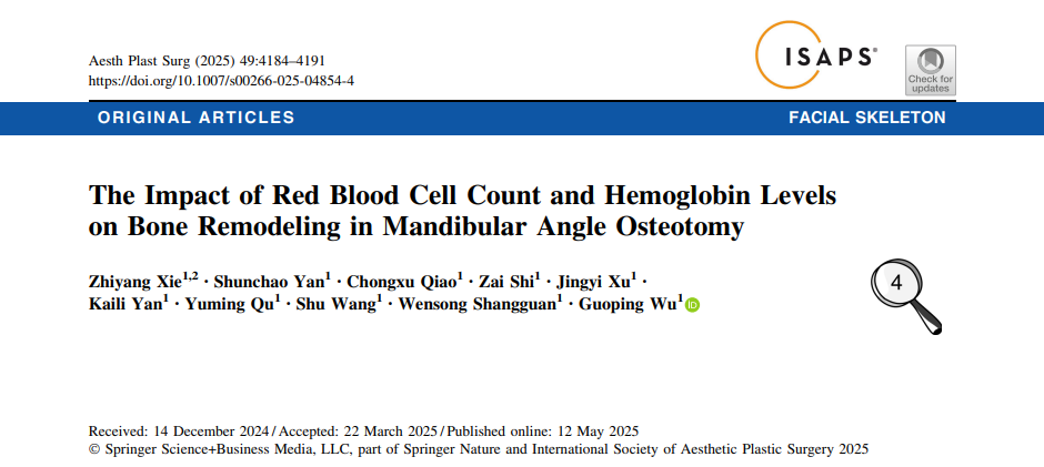 吴国平教授团队的研究发现除了手术技术,患者自身的生物学因素也可能影响长期疗效。吴国平教授为通信作者,谢知洋医师为第一作者的论文《The Impact of Red Blood Cell Count and Hemoglobin Levels on Bone Remodeling in Mandibular Angle Osteotomy》发表于《Aesthetic Plastic Surgery》2025年第49卷第15期,这项创新性研究探讨了术前红细胞计数(RBC)和血红蛋白(Hb)水平与下颌角区域术后骨改建(包括骨再生与骨吸收)的关联。通过对135例患者术前术后CBCT影像的定量分析,研究发现较高的术前RBC和Hb水平是术后骨再生的独立预测因子。具体而言,RBC每增加1×1012/L,骨再生概率增加2.558倍;Hb每增加1 g/L,概率增加1.036倍。这一发现提示,血液学参数可能作为术前评估的潜在生物标志物,帮助外科医生根据个体情况调整截骨策略,以优化长期骨轮廓稳定性。